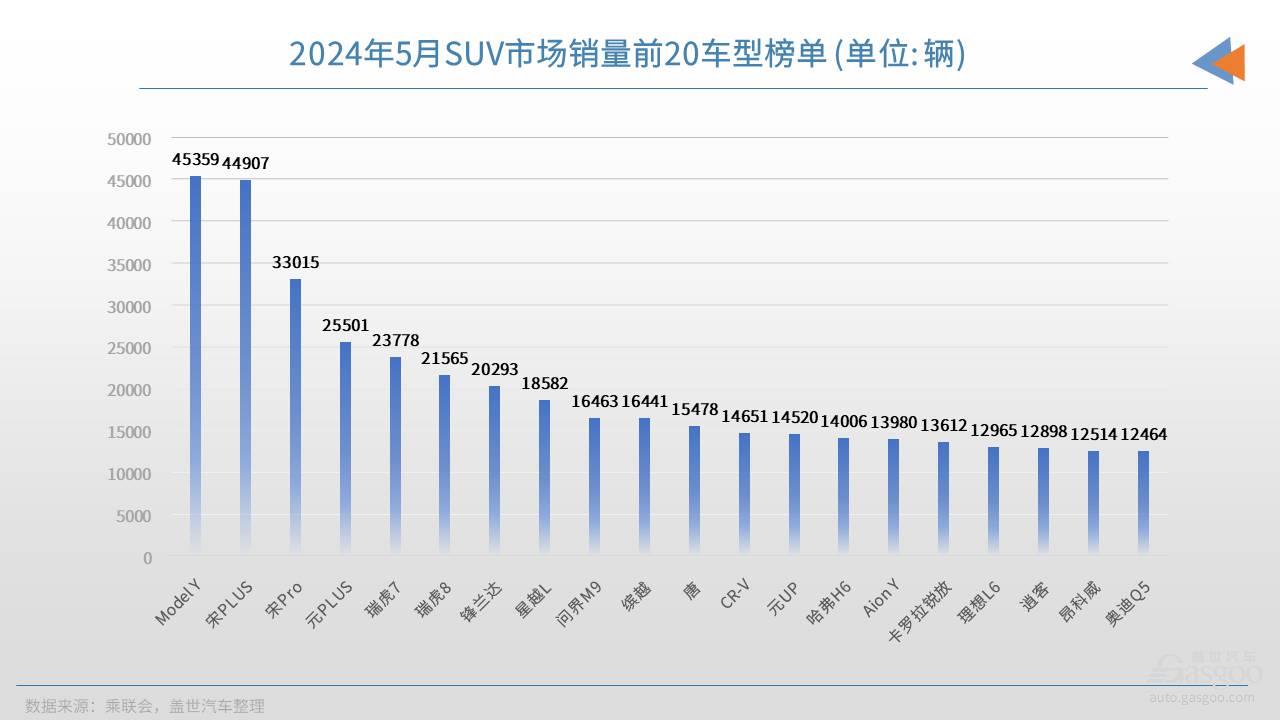 5月国内SUV市场依旧呈现新能源产品全面领跑的市场态势,销量前四名全都是新能源车型,虽然特斯拉Model Y以微弱的优势,重新夺回了月销冠军,但整体上看,比亚迪依旧是国内新能源SUV市场上的“王者”,销量前四的SUV车型中,其他三款都是比亚迪旗下产品。