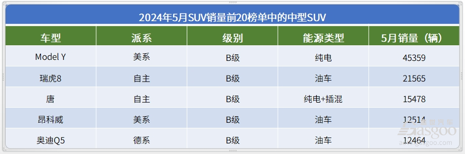 5月份的中型SUV市场上,特斯拉Model Y是最具“话语权”的产品,比亚迪旗下新能源车唐家族,在推出了荣耀版车型之后,也重新回归到了月销万辆以上的水平。此外,进入到SUV销量前20榜单的中型SUV还有3款油车,凭借性价比方面的显著优势,瑞虎8和昂科威,引领着国内大众化的B级燃油SUV市场,奥迪Q5L则引领着豪华B级燃油SUV市场。
