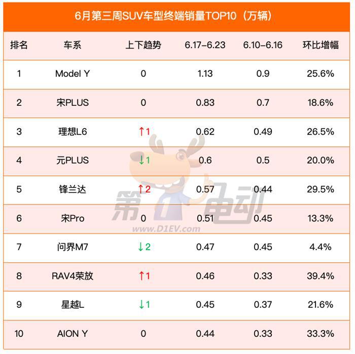 Model Y、宋PLUS依旧是消费者最受欢迎的两款SUV车型;理想L6排名上升一位,重回第三。