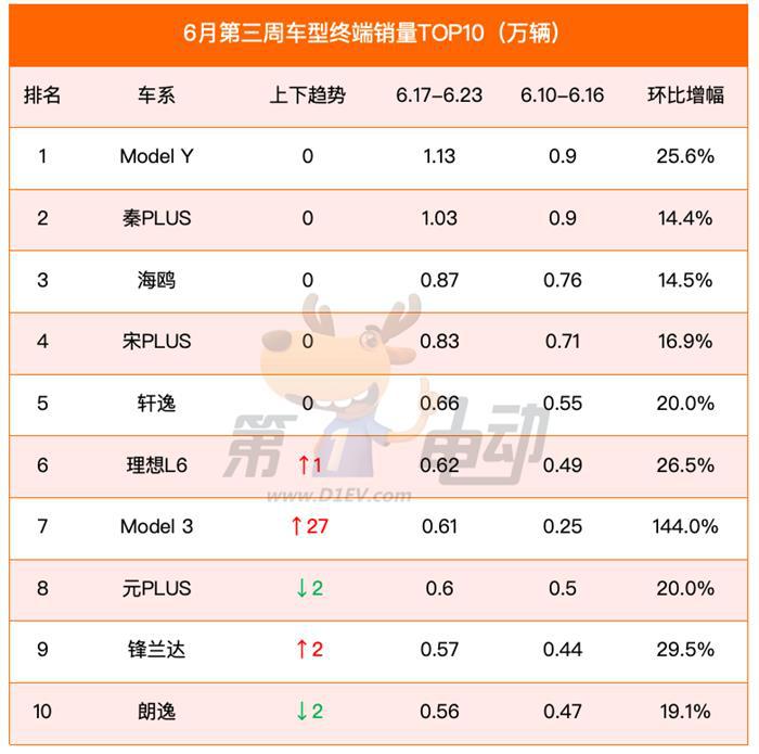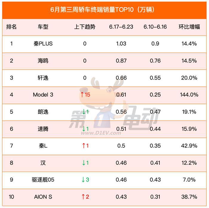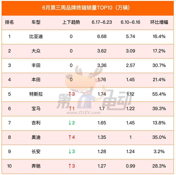 6月第三周(6.17-6.23)中国汽车终端销量出炉。