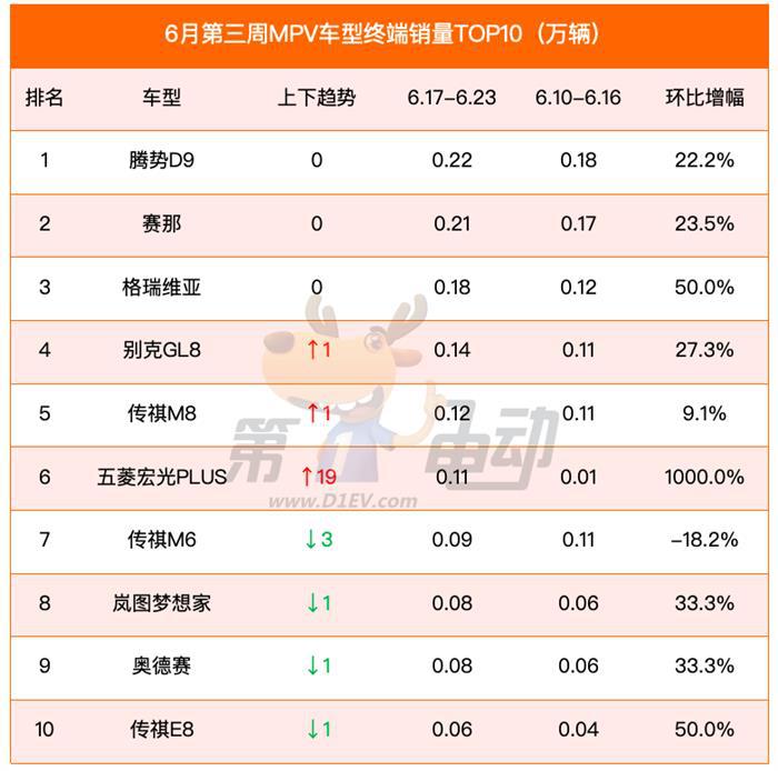 腾势D9、赛那、格瑞维亚稳居MPV榜前三。别克GL8周销量达到0.14万辆,环比大涨27%,排名上升一位至第四。