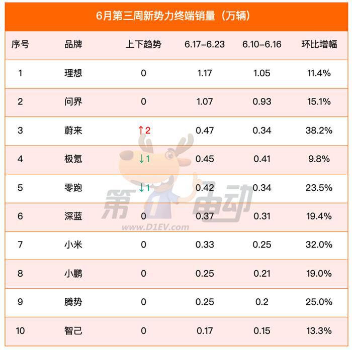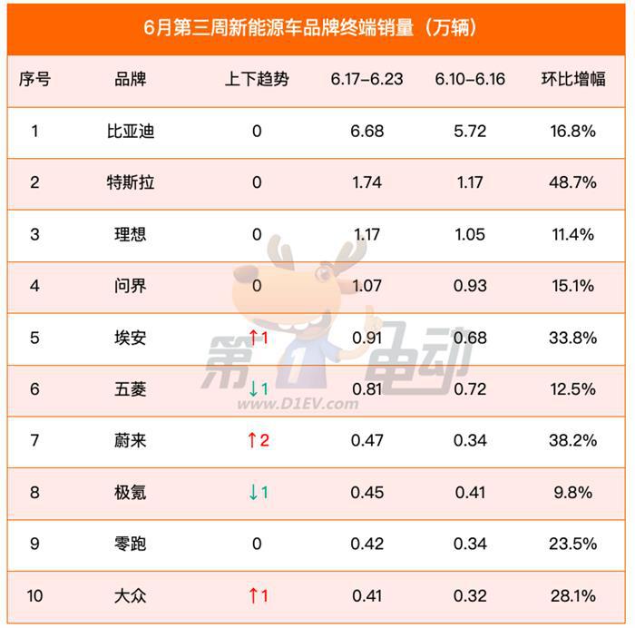 6月第三周中国新能源车品牌周销量榜出炉。