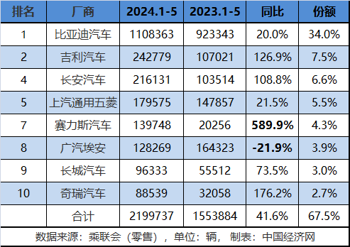 从乘联会发布的新能源厂商零售销量TOP10排行榜来看,5月入榜的8家传统品牌与上月保持一致,整体竞争格局愈发稳固。其合计市场份额虽比上月下降2.5个百分点,但合计销量却是提升6.7万辆至53万辆,这也创下了传统新能源单月销量近年来的新高。1-5月,传统新能源合计销量为220万辆,同比增长41.6%,市场份额为67.5%。