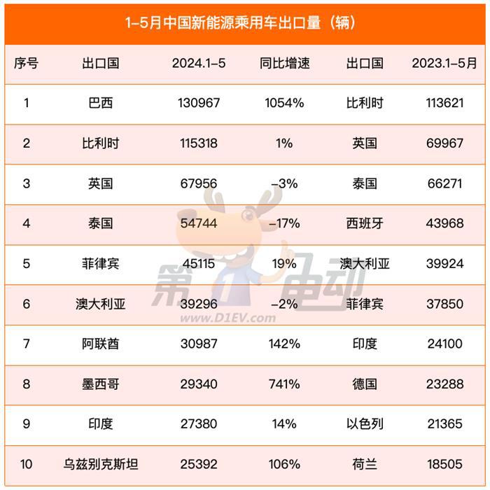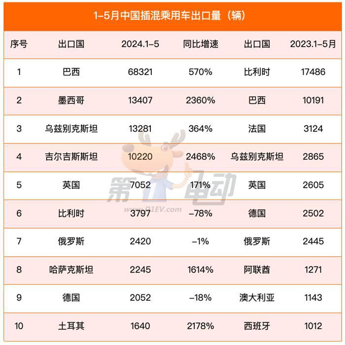 巴西同比暴涨5倍,超越比利时,成为中国插电式混合动力车最大出口国。