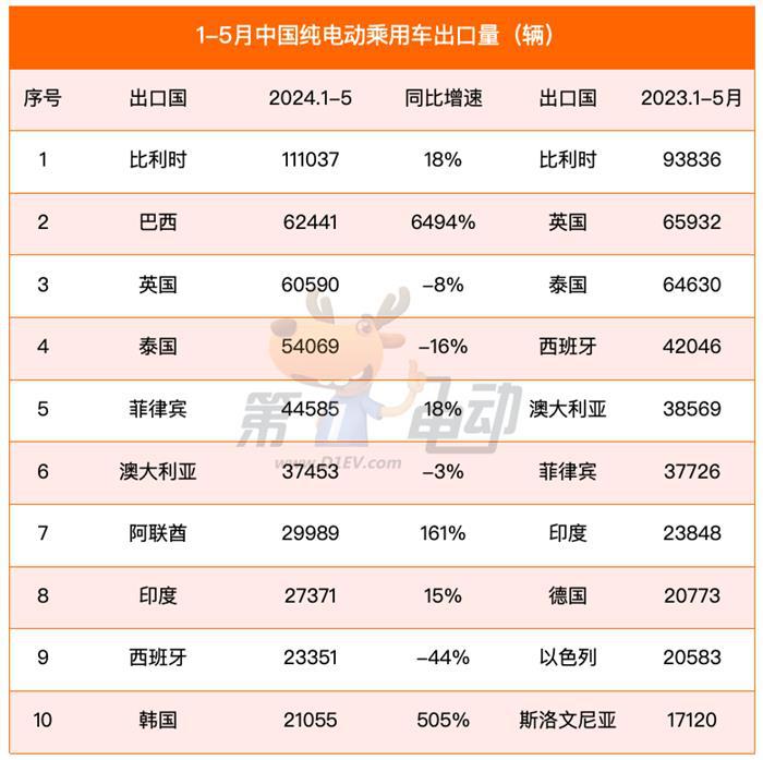 相反,出口到英国、泰国、澳大利亚和西班牙的纯电动车销量同比均出现下滑。德国、以色列和斯洛文尼亚落榜,取而代之的是巴西、阿联酋和韩国的上榜。