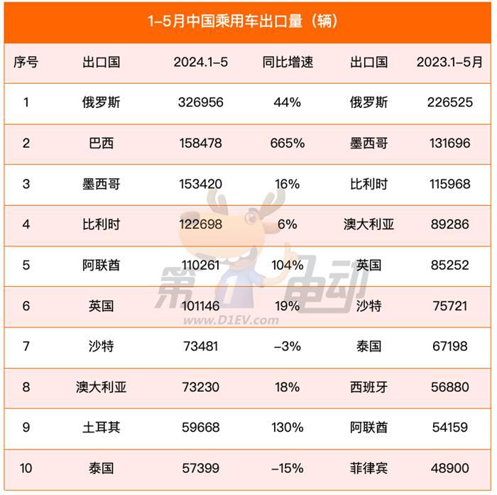俄罗斯、巴西、墨西哥是1-5月中国乘用车出口量最多的三大国家;巴西、比利时和英国是1-5月新能源乘用车出口量最多的三大国家。
