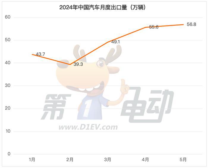 根据乘联会数据,2024年5月中国汽车出口量达到56.8万台,同比增长29%、环比增长2%。1-5月中国汽车出口量达到245万台,同比增长26%。