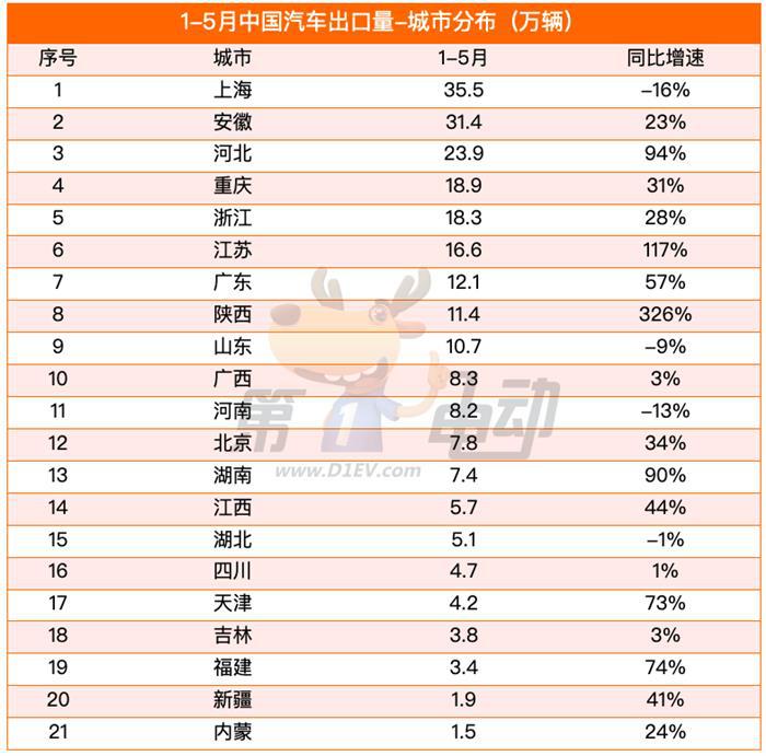 浙江、湖北、广西和辽宁四个省的出口量同比也出现下滑。而陕西、江西、河北、安徽、湖南、福建、新疆的出口量同比均实现翻倍暴涨,且陕西出口量同比暴涨超13倍,其出口量暴涨的原因预计是比亚迪出口量的大涨。1-5月比亚迪出口量为17.62万辆,同比增长1.6倍。
