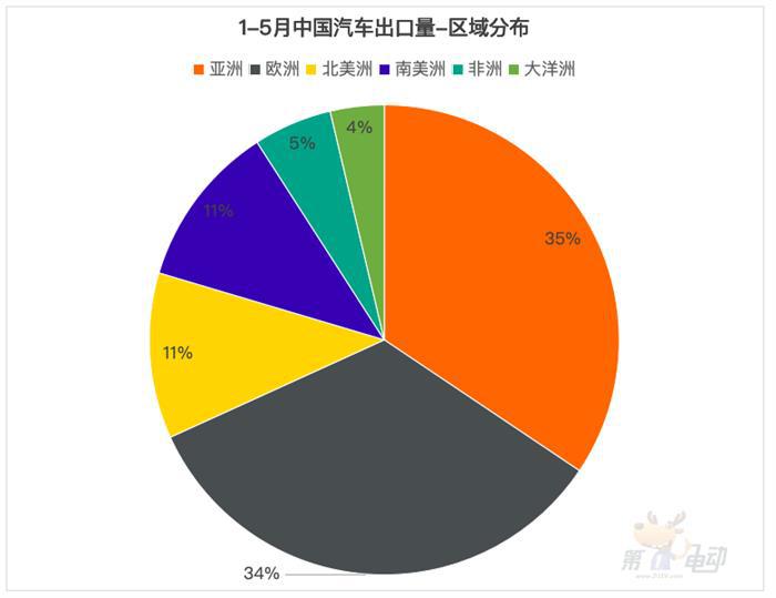 分区域来看,亚洲和欧洲是1-5月中国汽车出口量最多的两大洲,分别占比34.4%和33.8%;其次是北美洲和南美洲占比均超11%。