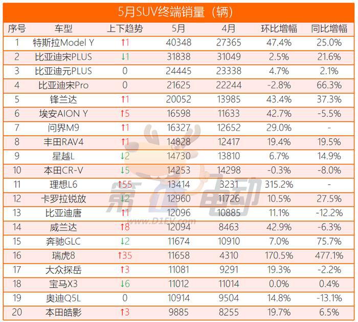 5月TOP20 SUV榜中,特斯拉Model Y反超宋PLUS夺得中国SUV市场销冠,宋PLUS排名下降一位至第二,紧随其后的是元plus和宋pro。本田CR-V跌落前五,锋兰达环比大涨43.4%,排名上升一位至第五。