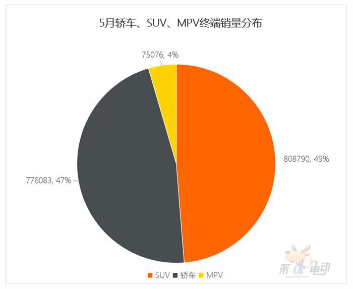根据终端销量数据,5月轿车市场终端销量77.6万辆,环比上涨10.3%,占比47%;SUV市场终端销量80.9万辆,环比上涨14%,占比高达49%;MPV市场终端销量仅7.5万辆,环比下降9.7%,占比仅4.5%。