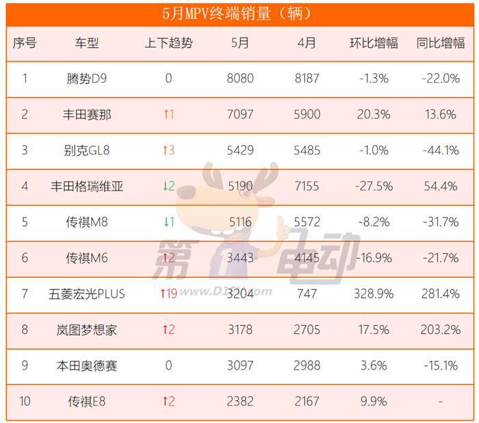 5月TOP10 MPV榜中,腾势D9终端销量虽然环比下降1.3%,但其以超8000辆的终端销量稳居MPV销量榜冠军,这是其今年以来第4次夺得MPV细分市场销量冠军。