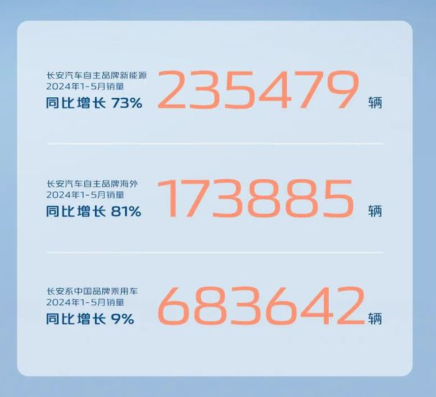 长安汽车销量达成率在几大国有汽车集团中表现最好的原因并不难找,自主新能源得到市场肯定,海外市场销量大涨。根据长安官方数据,1-5月长安自主新能源销量达235479辆,而出口方面累计销量173885辆,前者同比上涨73%,后者同比上涨81%,都属于大涨,这也带动长安自主品牌同比上涨了9%。