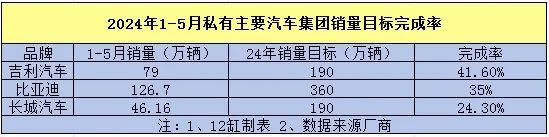 私有汽车厂商中,吉利为销量目标完成率最高者,其2024年销量目标为190万辆,1-5月的销量已经达到了79万辆,目标完成率41.6%,细化到自然销售月,基本属于达标状态。