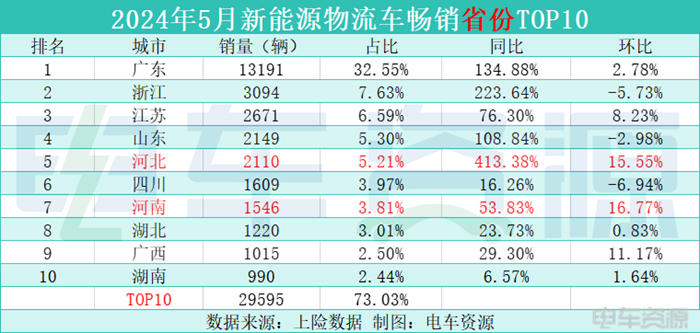 5月,新能源物流车市场整体回暖,河北增长表现最出色,销量主要来自于石家庄。