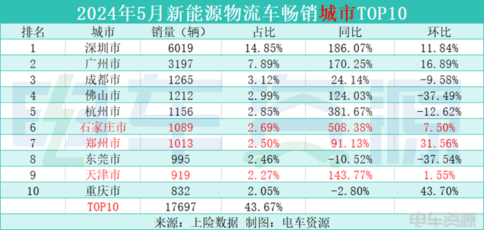 其次,广州较上月排名无变化,稳居第二,5月共销3197辆,实现同环比双增长。中面和轻卡两款细分车型最为畅销,畅销的有远程星享V6E、开瑞江豚EV、远程星智H、蓝擎·悦新能源轻卡。