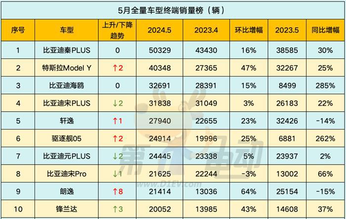 TOP20全量车型榜中,新能源车占据12款,其中7款车位居前十,且有6款来自比亚迪,相比4月减少一款。在4月位居榜单第九的比亚迪汉,跌落至第11。海鸥、驱逐舰05同比翻倍暴涨,而轩逸、朗逸、速腾同比出现大降。