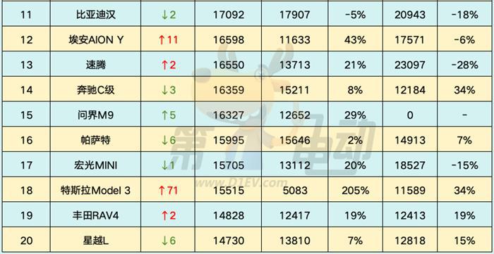 与去年同期相比,TOP20全量车型榜中,比亚迪海鸥、驱逐舰05、秦PLUS、宋PLUS、宋Pro、Model Y、Model 3等新能源车同比均大幅上涨,且海鸥、驱逐舰05同比翻倍暴涨。