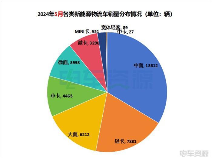 5月各类新能源物流车的占比情况是:中面销量最高,占比为33.59%;轻卡位于第二位,市占比为19.45%;大面位于第三位,市占比为15.33%。小卡、微面、微卡市占比依次是11.02%、9.87%、8.12%。