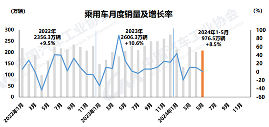 具体到乘用车方面,5月产销分别完成205.1万辆和207.5万辆,环比分别增长0.1%和3.7%,同比分别增长2%和1.2%;1-5月产销分别完成970.9万辆和976.5万辆,同比分别增长7.1%和8.5%。