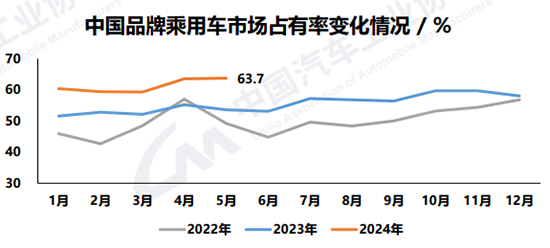 在乘用车市场中,中国品牌市占率居高不下。5月,中国品牌乘用车销量为132.3万辆,同比增长20.4%,占乘用车销售总量的63.7%,比上年同期提升10.2个百分点;1-5月,共销售598.7万辆,同比增长25.2%,市场份额为61.3%。