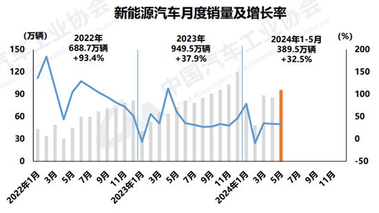 值得一提的是,新能源汽车表现更加亮眼。5月,新能源汽车产销分别完成94万辆和95.5万辆,同比分别增长31.9%和33.3%,市场占有率达到39.5%;1-5月,分别完成392.6万辆和389.5万辆,同比分别增长30.7%和32.5%,市场占有率达到33.9%。