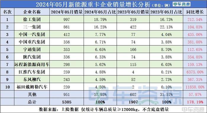 2024年5月,销量冠军企业是徐工集团,销售997辆,占比18.79%;销量亚军企业是三一集团,销售861辆,占比16.23%;销量季军企业是中国一汽集团,销售412辆,占比7.77%。
