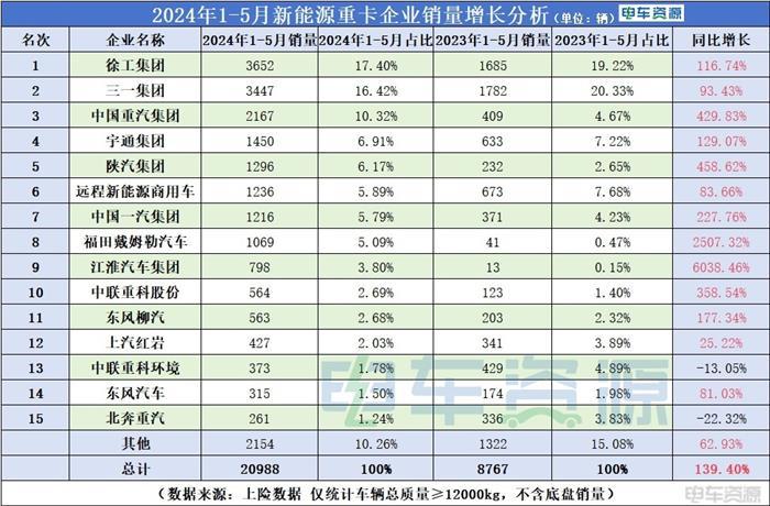 据电车资源统计(数据来源:上险数据,不含军车、出口车辆),2024年1-5月新能源重卡共销售20988辆,同比增长139.40%,其中5月份新能源重卡共销售5305辆,同比增长178.19%,环比增长15.13%。销量延续了增长趋势,预期销量将持续增长。
