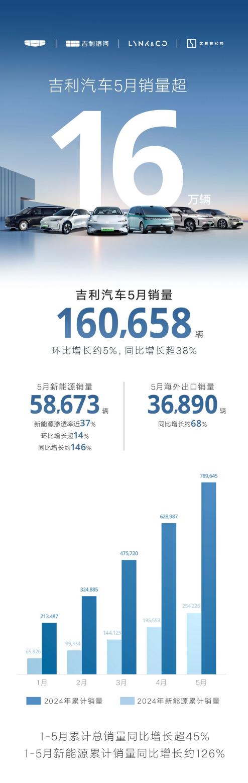 6月2日,吉利汽车控股有限公司公布最新销量数据:5月乘用车销量160,658辆,同比增长超38%,环比增长约5%。其中,新能源增幅延续高调走势,5月集团新能源销量(含吉利、领克、极氪)58,673辆,同比增长约146%,环比增长超14%。