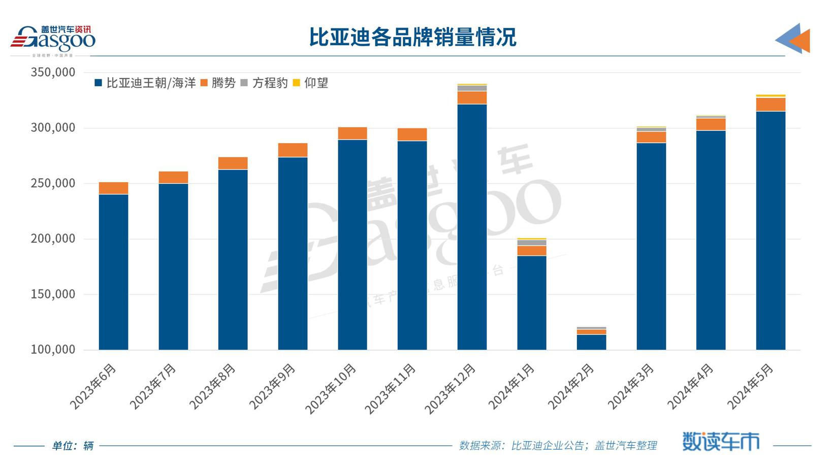 具体到各品牌,比亚迪王朝/海洋品牌、腾势、方程豹、仰望品牌分别销售了315,227 辆、12,223 辆、2,430 辆以及608辆新车。