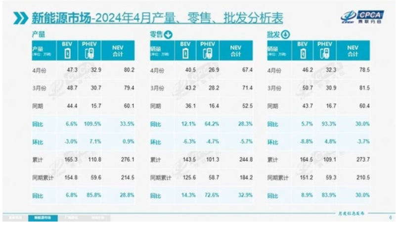 而另一方面,4月纯电动乘用车批发销量达到46.2万辆,同比增长5.7%,环比下降8.8%;真插混批发销量达到25.5万辆,同比增长103%,环比增长10%;增程式批发销量达到6.9万辆,同比增长64%,环比下降10%。