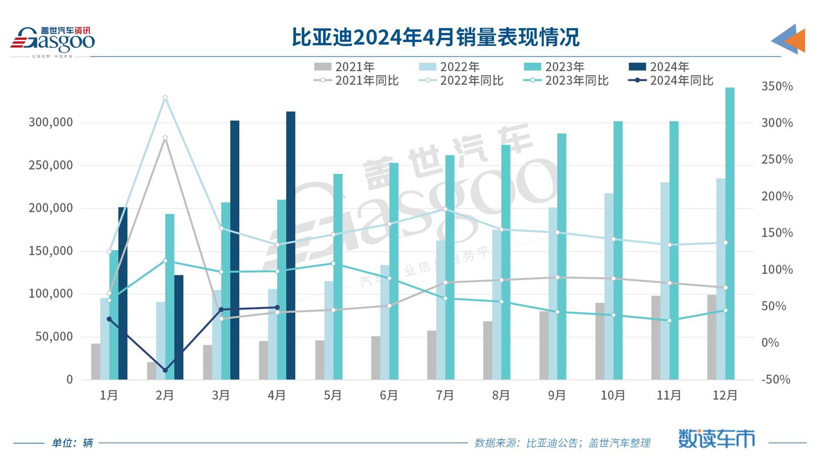 5月1日,根据比亚迪发布的最新产销数据显示,在刚刚过去的4月份,其累计销售313,245辆新能源车,较去年同期增长了48.96%,环比3月微增3.57%。