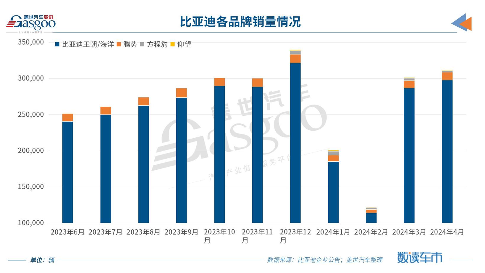 具体到各品牌,比亚迪王朝/海洋品牌、腾势、方程豹、仰望品牌分别销售了297,864 辆、11,122辆、2,110辆以及952 辆新车。