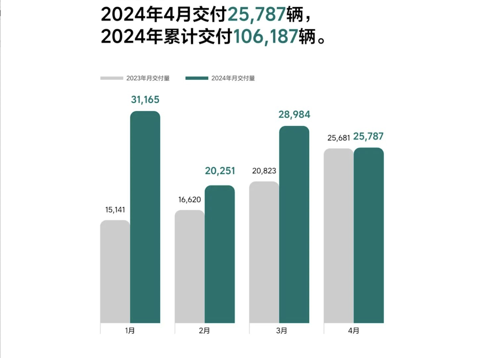 五一劳动节,理想发布4月销量数据,交付25,787辆,同比微增0.4%;1-4月累计交付量为106,187辆。