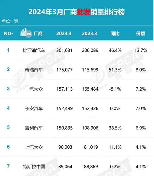 与此同时,乘联会发布的数据显示,3月份,比亚迪在中国的批发销量为301,631辆,市场份额为13.7%。而同期一汽大众和上汽大众在华市场份额分别为7.2%和4.1%。