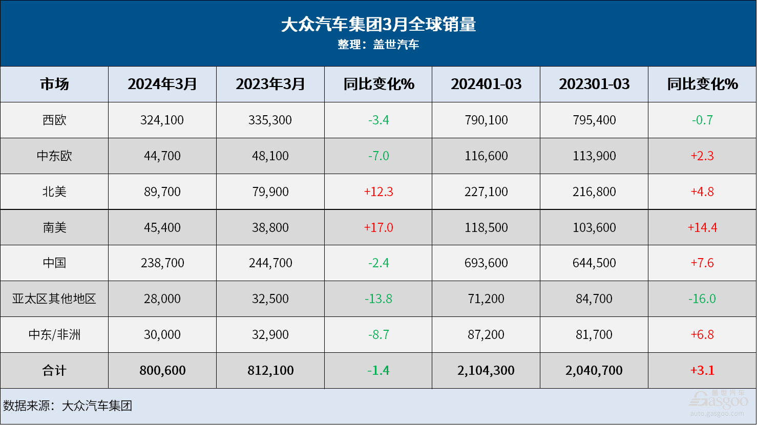 而大众汽车集团近期发布的数据显示,2024年3月份,大众汽车集团在全球的销量同比下滑1.4%,至80.06万辆,同期在华销量也下滑2.4%,至23.87万辆。