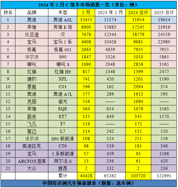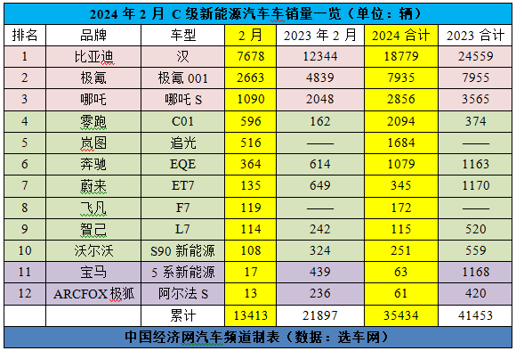 作为参照,去年2月,比亚迪汉、极氪001、哪吒S、奔驰EQE、蔚来ET7、智己L7、沃尔沃S90新能源、宝马5系新能源、极狐阿尔法S的销量分别为12344辆、4839辆、2048辆、614辆、649辆、242辆、324辆、439辆、236辆。