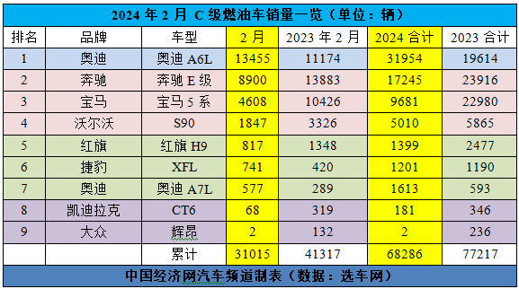 今年前2个月,燃油车的销量之和为68286辆,与去年同期的77592辆相比下滑11.99%,在C级车总销量中的占比为65.84%;新能源车的销量之和为35434辆,与去年同期的45099辆相比下滑21.43%,在C级车总销量中的占比为34.16%。