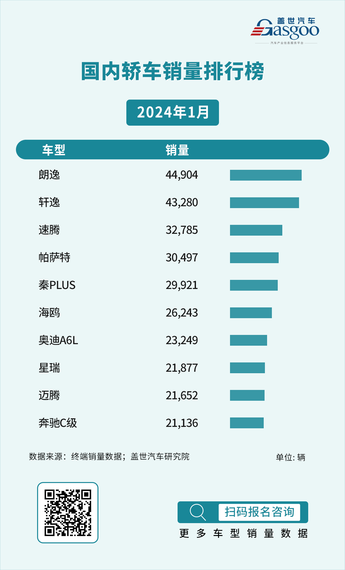 从2024年1月国内轿车销量情况来看,一汽大众和日产作为传统合资品牌,仍然保持着强劲的市场竞争力,朗逸凭借其卓越的品质、出色的性能和广泛的用户口碑,以44,904辆的销量成绩脱颖而出,夺得当月轿车市场的销量冠军。日产轩逸以43,280辆的销量紧随以后,竞争激烈;比亚迪作为国内新能源汽车品牌的代表,在轿车市场也展现出了不俗的竞争力,秦PLUS和海鸥两款车型成功冲进前10榜单,分别以29,921和26,243的销量成绩排在第5、第6位。