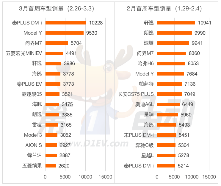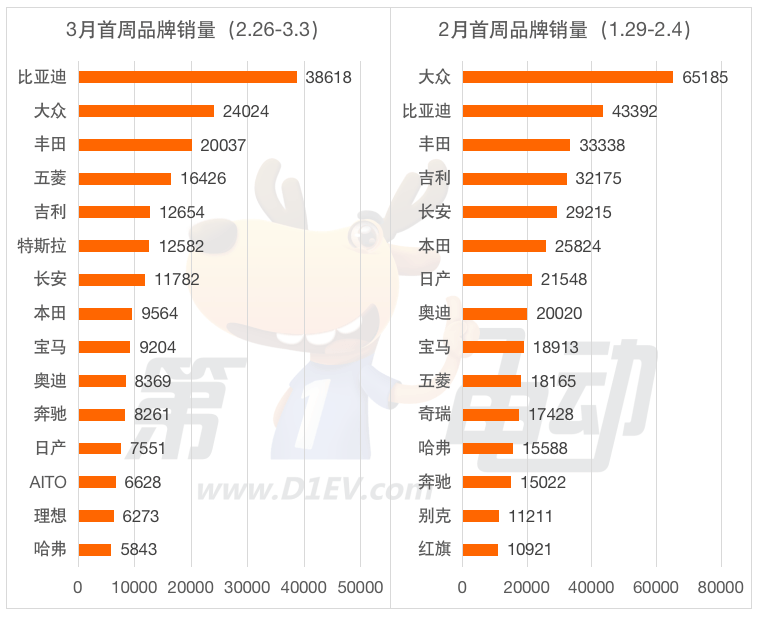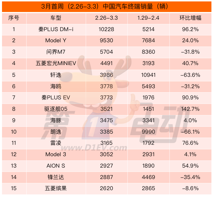 日前,3月第一周(2.26-3.3)中国汽车终端销量出炉。
