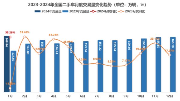 二手车方面,1月,全国二手车市场交易168.84万辆,同比增长35.26%,环比增长1.65%,交易金额为1123.17亿元。其中,新能源二手车共交易8.95万辆,环比增长2.5%,同比增长134.5%。