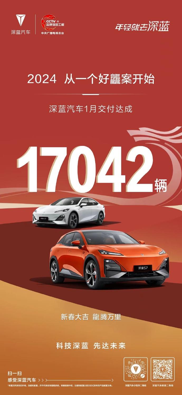 据最新交付数据,深蓝汽车2024年1月交付17042辆,同比增长177.69%,相比2023年12月下滑7.07%。