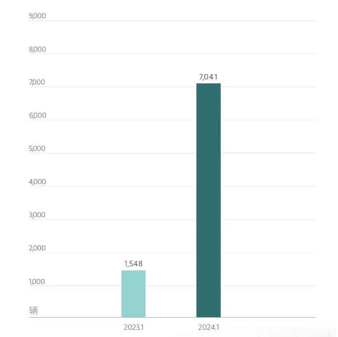 2024年2月1日,岚图汽车公布1月交付成绩,数据显示,当月其完成交付7,041辆,同比增长355%,但较去年12月环比下降29.71%。