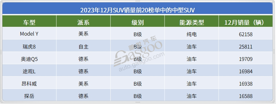 Model Y之外,去年12月畅销的其他中型SUV都是油车。瑞虎8已经成为奇瑞汽车最粗壮的市场“大腿”,2023年12月创纪录的交出了超2.5万辆的月销量。能够持续保持不错的市场热度,瑞虎8不错的性价比优势是关键,此外,不断推出新版本刺激市场,也是瑞虎8目前能够长期热销的关键原因。