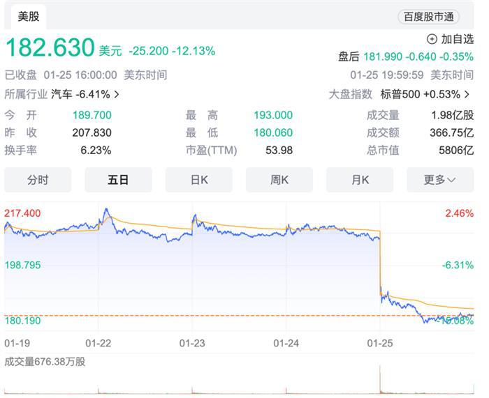 当地时间1月25日,美股三大指数集体收涨,而特斯拉逆市跌超12%,创一年来最大单日跌幅市值一,夜蒸发801亿美元(约5743亿元)。据《福布斯》计算,马斯克个人财富也缩水约180亿美元。