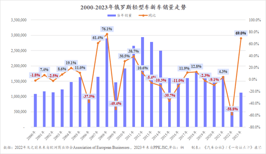 PPK JSC(基于新车销售给车主的成交数)的数据显示,2023年俄罗斯轻型车市场共售出112.8万辆新车,同比增长57.8%,其中乘用车为105.9万辆,同比增长69.0%。