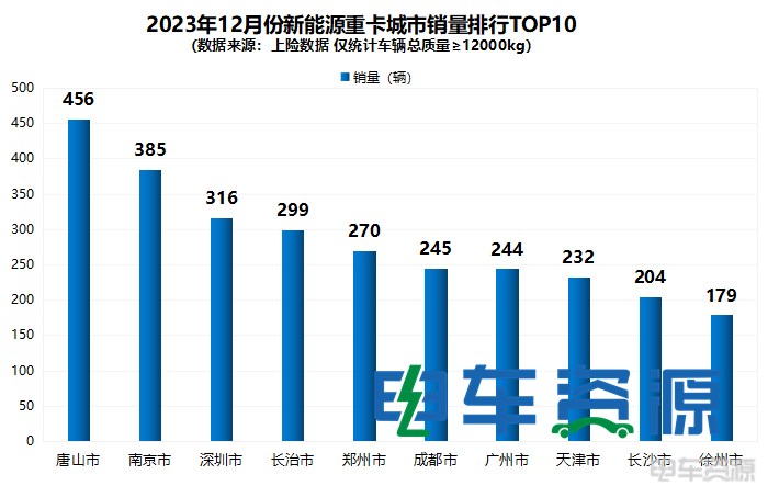 12月份新能源重卡销售6278辆,同比增长1.83%。当月164座城市有销售新能源重卡,有16城市销量超100辆,唐山市销售456辆,夺得城市月销量冠军。