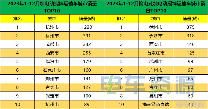 新能源搅拌运输车(简称:搅拌车,下同)主要应用在市政工程建设领域,在1-12月销量超5300辆,达到5318辆,主要销售城市为长沙市、徐州市、成都市、西安市、石家庄市等城市。