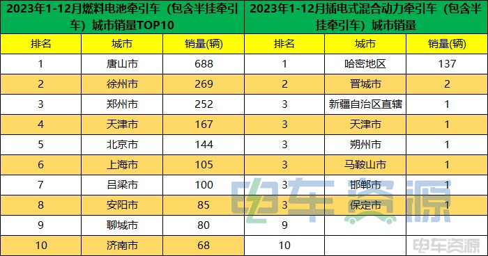 燃料电池牵引车共销售2452辆,主要销售城市为唐山市(688辆)、徐州市(269辆)、郑州市(252辆)等,插电式混合动力牵引车在哈密地区销售137辆,在晋城市销售2辆,新疆自治区直辖地区、天津市、朔州市、马鞍山市、邯郸市、保定市各销售1辆。