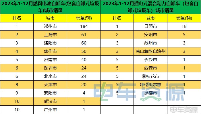 燃料电池自卸车销量较少,共销售469辆,在郑州市(184辆)、上海市(61辆)、洛阳市(60辆)等城市有销售。插电式混动自卸车在日照市(18辆)、安阳市(5辆)、苏州市(3辆)、凉山彝族自治州(3辆)、长沙市(1辆)、西安市(1辆)、攀枝花市(1辆)、承德市(1辆)、呼伦贝尔市(1辆)有销售。